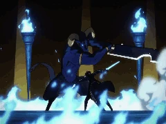 Se battant ensemble, Asuna et Kirito parviennent à blesser le boss, mais ils se font blesser à plusieurs reprises. L'épéiste noir recule alors, demandant à ses camarades de retenir le monstre quelques instants. S'éloignant du combat, le garçon fait apparaître la fenêtre de son statut, et y manipule plusieurs options, avant de charger à nouveau le démon aux yeux azur.